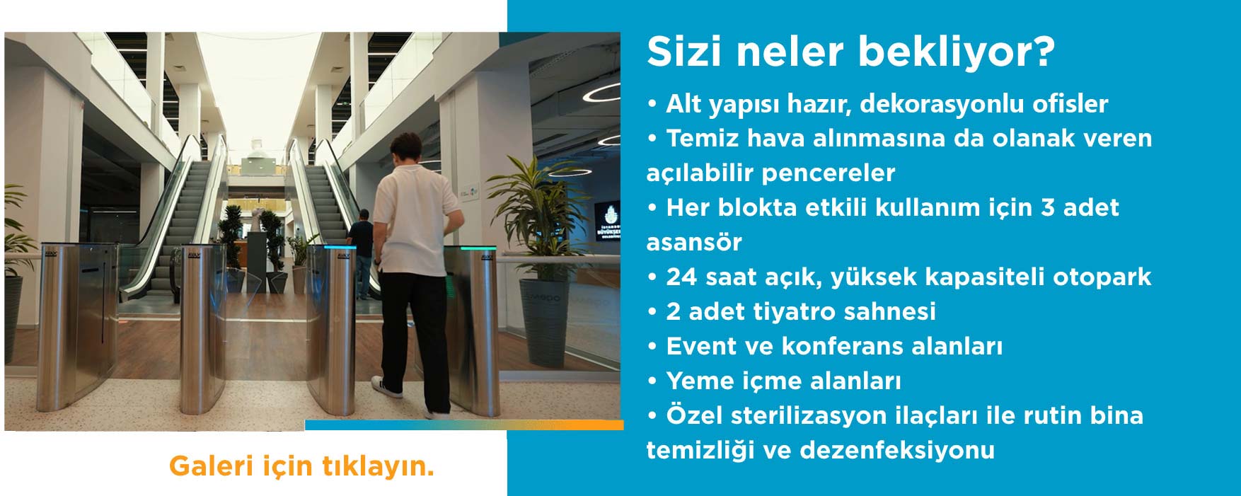 Kullanıma hazır 3 bloktan olusan ofisler, konferans salonları, açık sergi ve etkinlik alanlarına ek olarak, 2 tiyatro salonu, cadde mağazaları, kapalı otoparkı ile hizmetinizdeyiz.