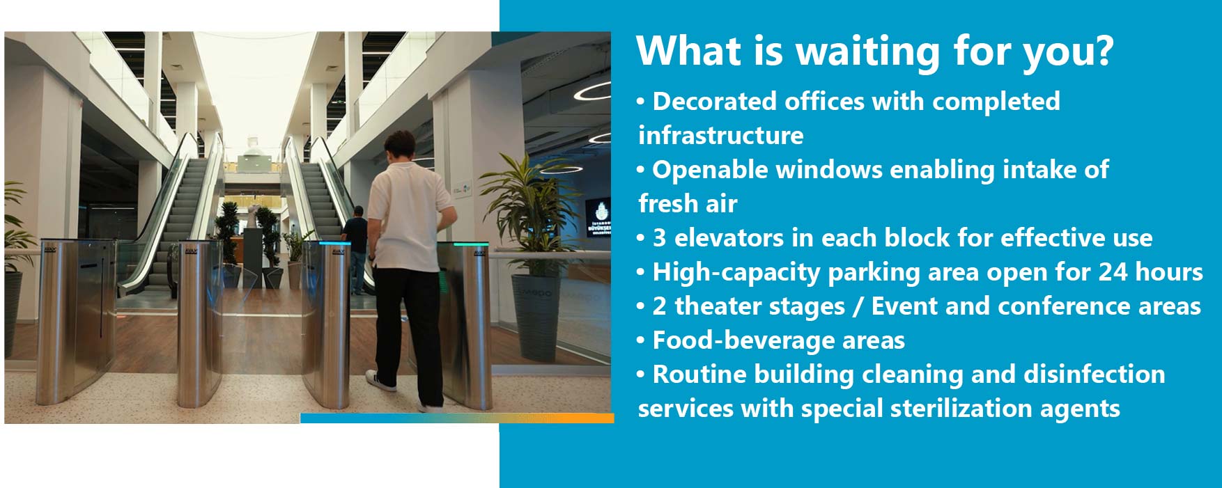 stores and parking garage, as well as offices consisting of ready-to-use 3 blocks, conference halls, open-air exhibition and event areas.